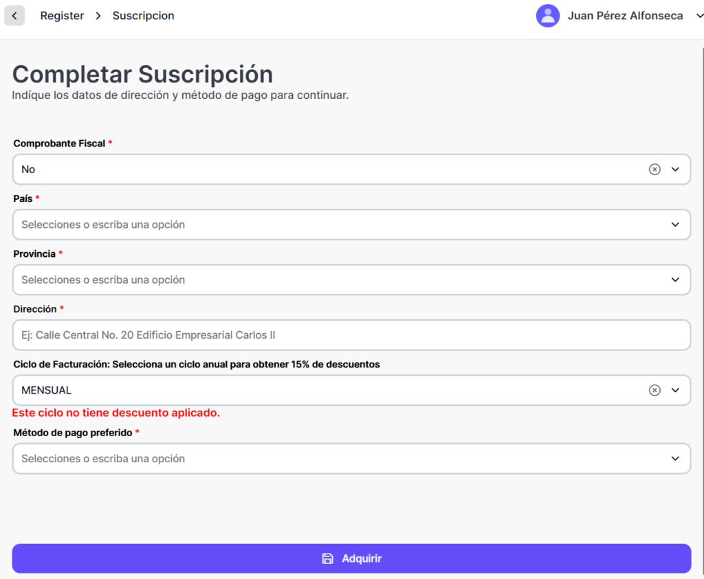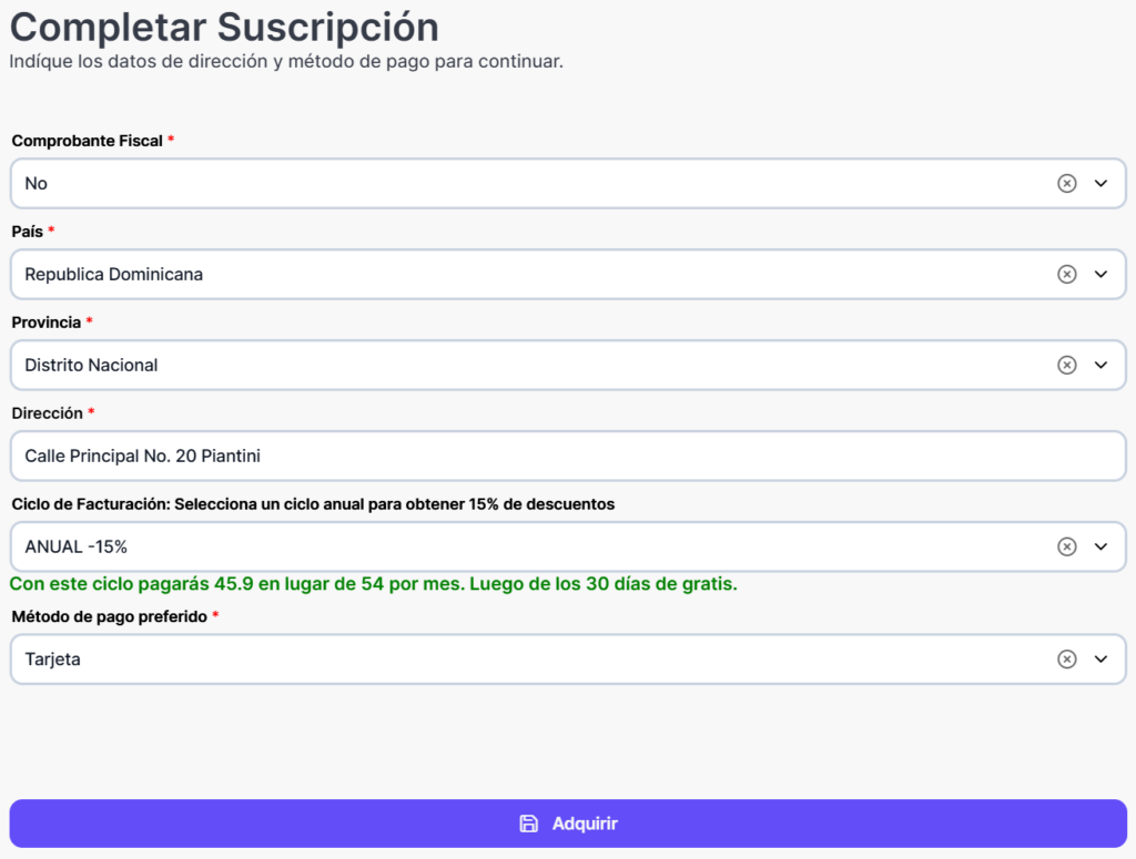 La opción de comprobante fiscal la usará si cuentas con un RNC de persona física o jurídica, en caso contrario la dejas en No. También considera que según el ciclo de facturación que selecciones puedes tener hasta un 15% de descuento en tu suscripción. ¿Cómo funciona?