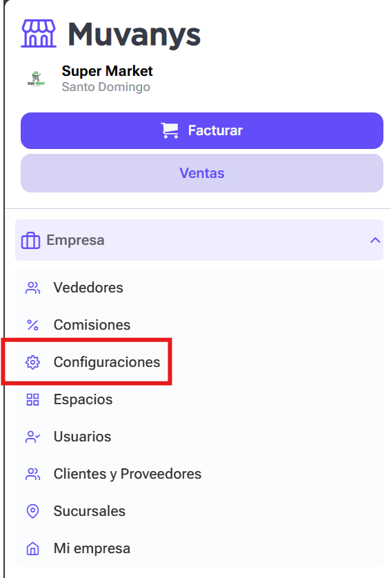 1- Para acceder a las configuraciones, puedes acceder desde el botón de ajustes en la parte superior derecha o desde el menú Empresa -> Configuraciones, como se muestra en las imágenes siguientes: