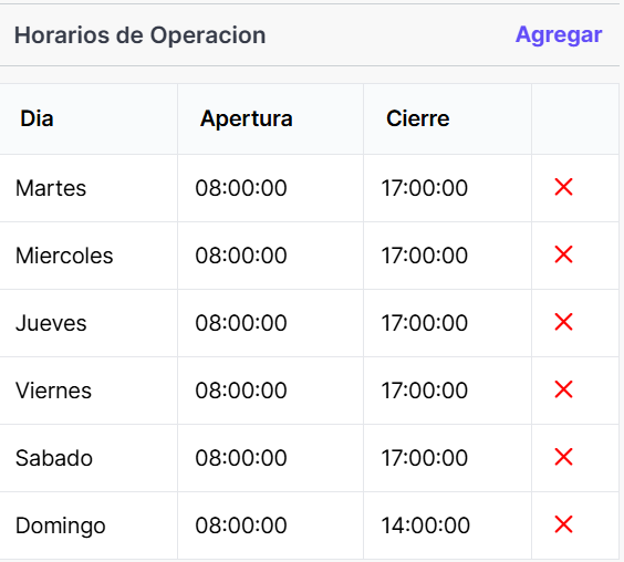 6- Horario de Operación: Está información es la que se mostrará a tus clientes cuando intenten ordenar desde su aplicación. Si ya estás fuera de horario laborar, no le permitirá ordenar. Puede que se agreguen funcionalidades adicionales en un futuro para esta parte.