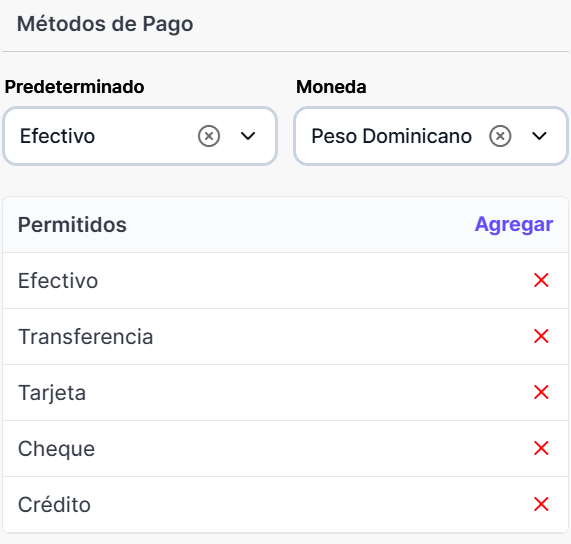4- Métodos de pago: En Muvanys puedes cobrar o pagar con diferentes métodos de pago, permite los que utilizas en tu negocio exclusivamente. Los métodos Efectivo, Transferencia y Tarjetas se agregan de forma predeterminada, en esta opción puedes quitar o agregar otros según necesites.