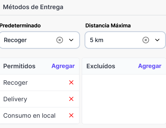 5- Métodos de entrega: Tus ventas puedes facturarlas con el método de entrega que consideres según la operación. Algunas de las propiedades solo tienen efecto para cuando esté disponible la app para ordenar de tus clientes, por el momento solo es relevante el método de entrega: